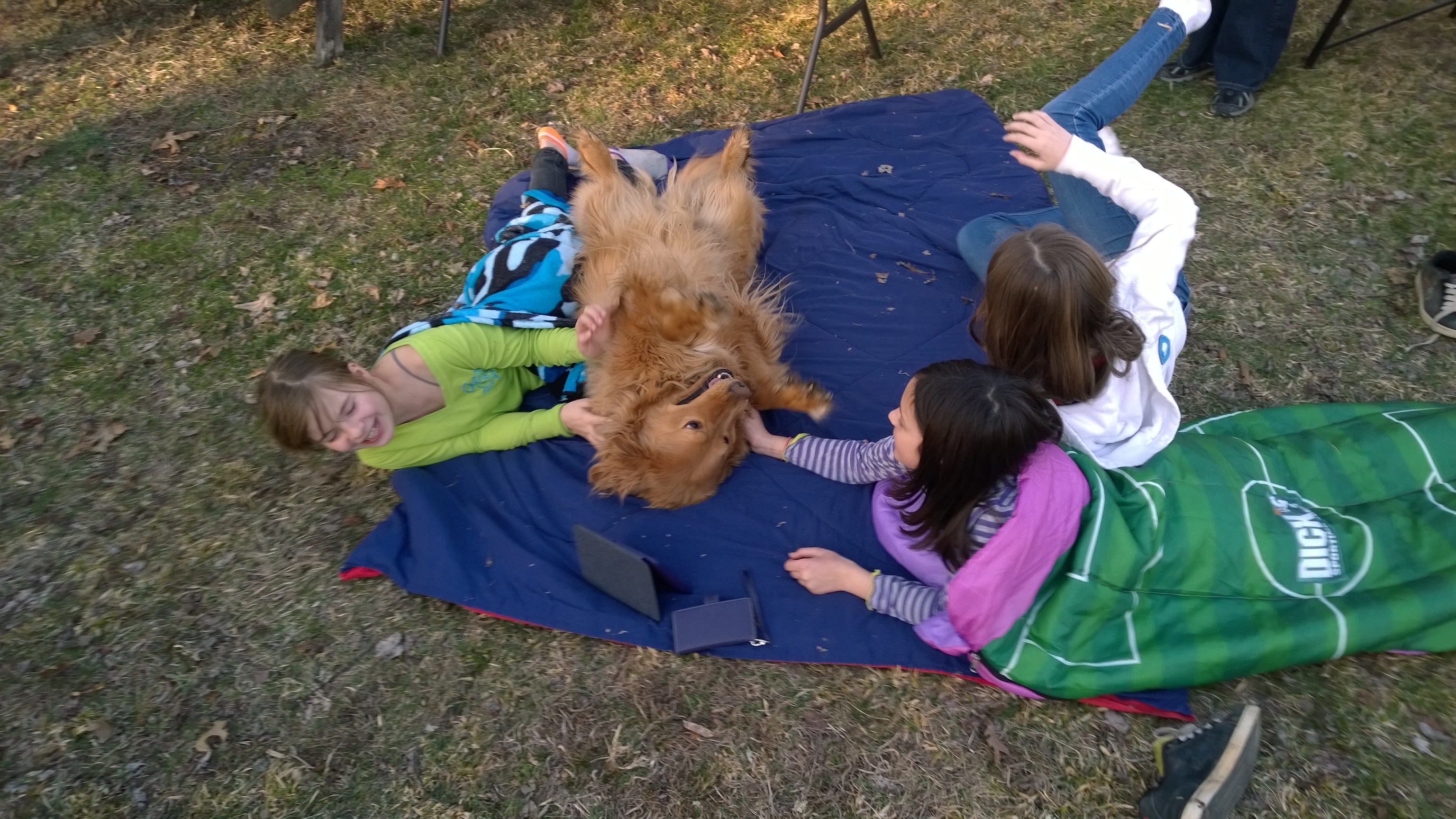 This particular picture was an amazing surprise! We were sitting around in the morning and out of nowhere comes this Golden Retriever. The amazing thing about dogs is each one has its own unique personality and every once in a while you encounter one with an exceptional personality. This particular dog was amazing and I truly wish I would have gotten this on video as it was an just one of those moments. This dog came out of absolutely nowhere and I’m assuming it was Cooters. He ran over to us unexpectedly, jumped on the blanket on his back and just started rolling all over the kids with this huge smile on his face. He had to have rolled around in the kids arms for at least 5 minutes. Immediately the kids started laughing, the dog just smiled away and we all just jumped into the moment. This was just one of those unforgettable times that I’ll never forget for the rest of my life. Joy and Bliss can come from the little and most unexpected thing if only we Program our Mind to enjoy these little things. ~~~Unknown