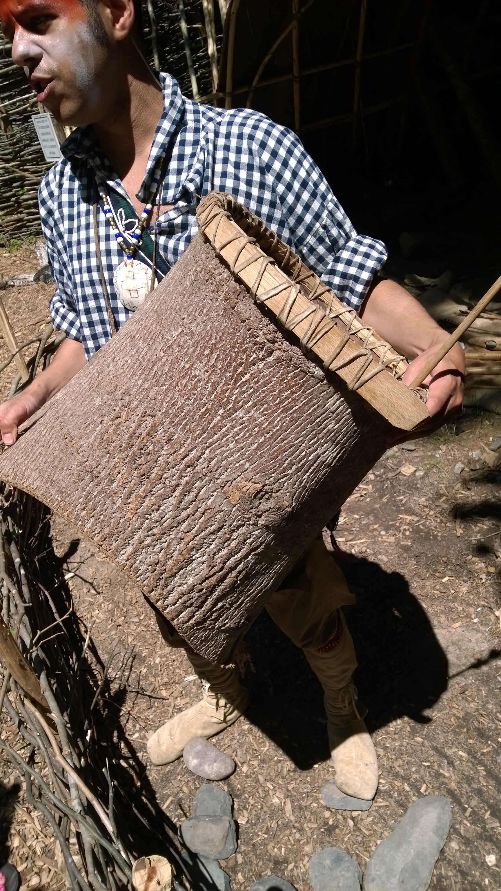 This was a backpack that was built out of bark. The amazing thing was there was a primitive drill that was used (I should have took a picture) to drill the holes in the bark which allowed the Indians to sew it together with leather twine. This was a primitive yet extremely effective container to carry whatever you may have needed at the time. The other Interesting thing to note was by the time the children of the tribe were 6 or 7 years old, they knew how to make these types of items. The gentleman explained that this type of education was essential to their survival.