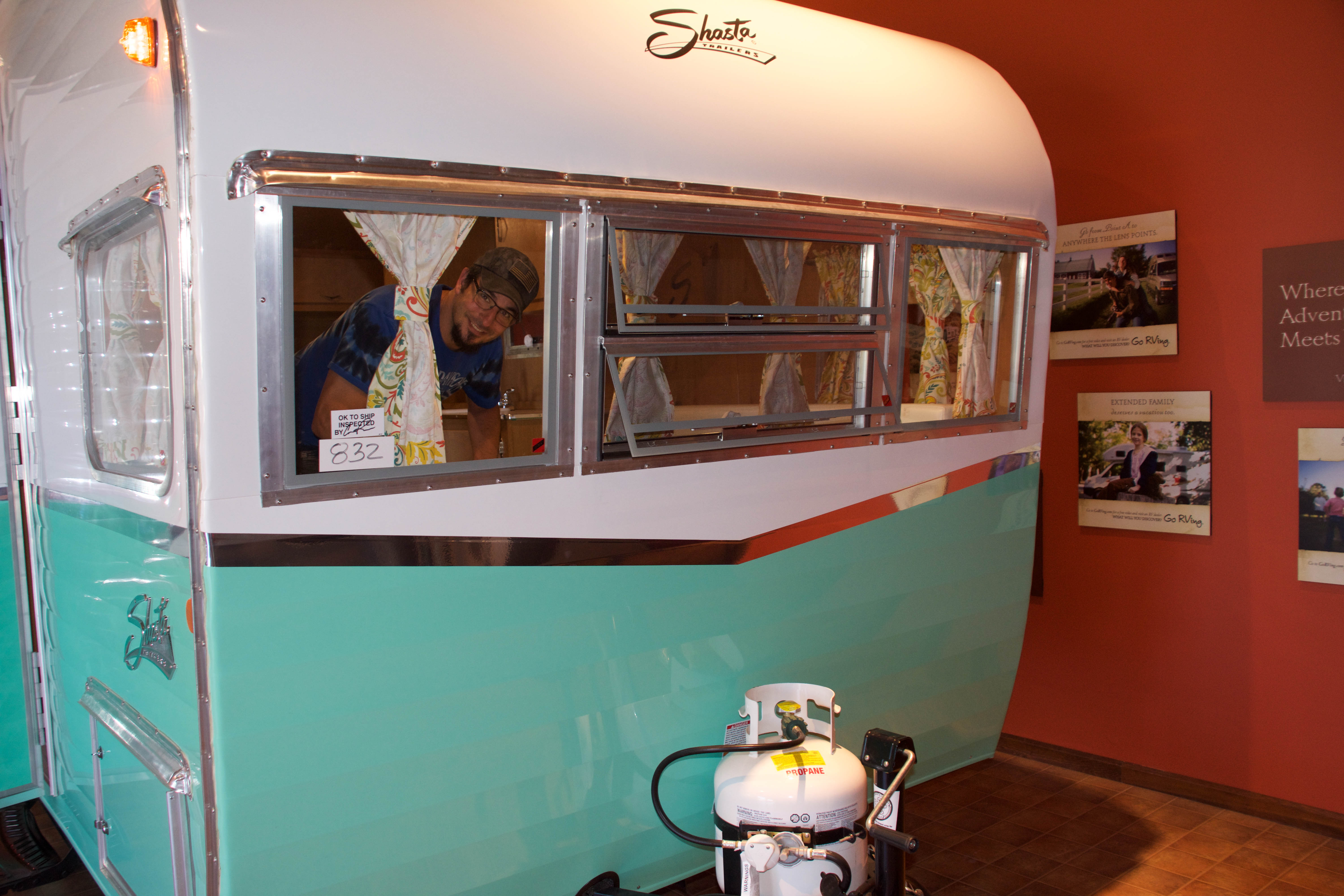 Here I am peaking outside the window of an old Shasta. All of the Shasta’s had a very retro feel from the 50’s or 60’s.